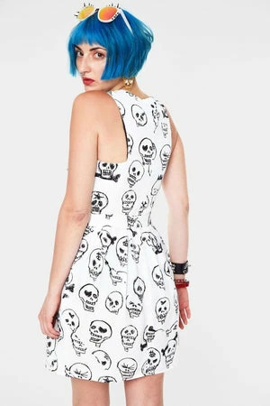 An appealing black gothic dress, with a superb print of various skull emoticons and a cheeky cut out at the front. This design is made in 100% polyester, also available in white with black print.