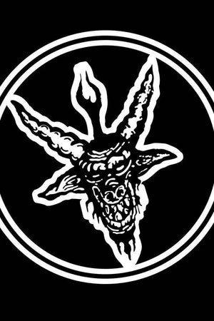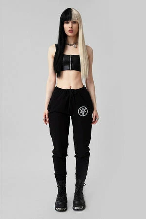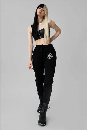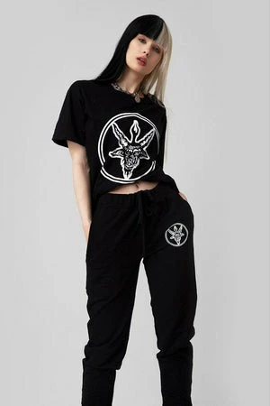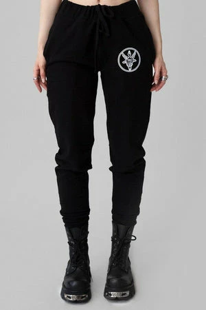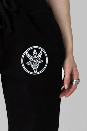 The black joggers have front “Baphomet” print, front ribbon tie, side pockets and a flattering fit.