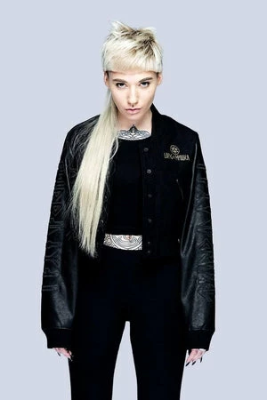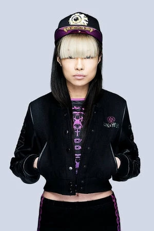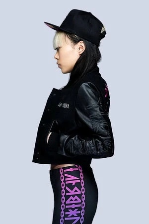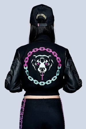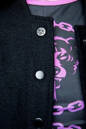 This striking black cropped varsity jacket by Long Clothing is a badassical style, designed in collaboration with Mishka 2.0. The jacket has a death adder design on the back, a bear with snake tongue surrounded by a link chain, on the front left chest is a Long x Mishka logo with a tribal symbol and the arms are embellished with runic writing. A superb style, completed with popper buttons up the front and side pockets.