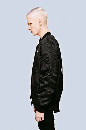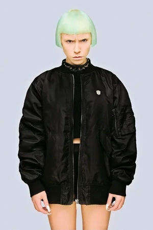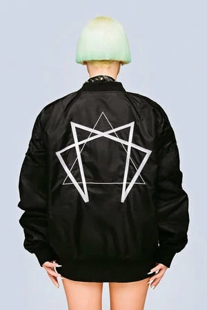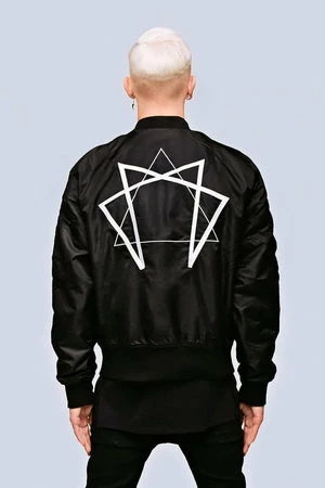A formidable black bomber jacket by Long Clothing , with an eye-catching embroidered badge on the front left breast and a striking enneagram design on the back. The enneagram of personality, is a model of the nine personality types of the human psyche.