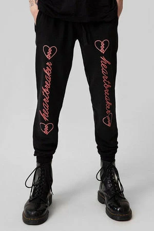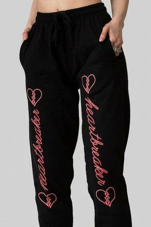 The black joggers have front “Heartbreaker” print, front ribbon tie, side pockets and a flattering fit.