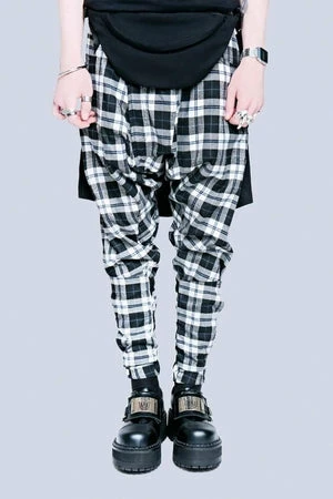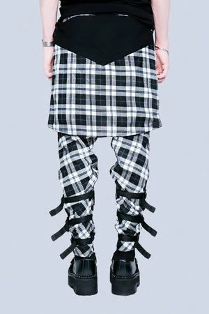 These alternative white and black tartan clip pants from Long Clothing are a striking style, they are designed by Oxby/Jorden and have adjustable clips on the sash and bag (both are included), they can be clipped to the front, side or back of the pants (or left off) and also have adjustable buckles at the bottom of the legs.