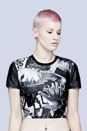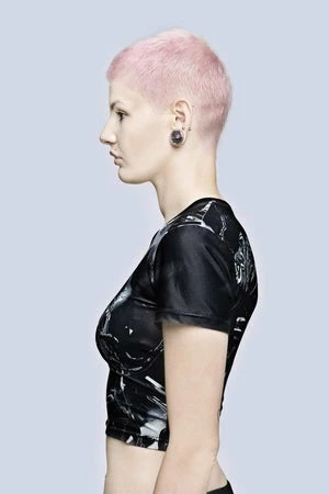 This is a killer black crop top design from Long Clothing, made in collaboration with “Pussykrew”, the post-human, experimental gothic art team from Poland.