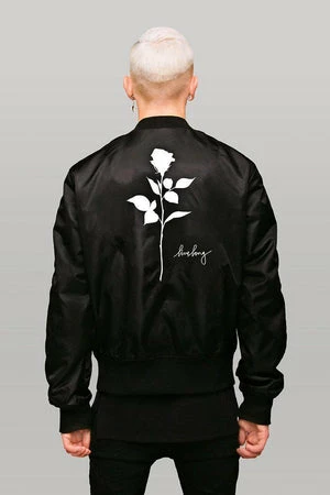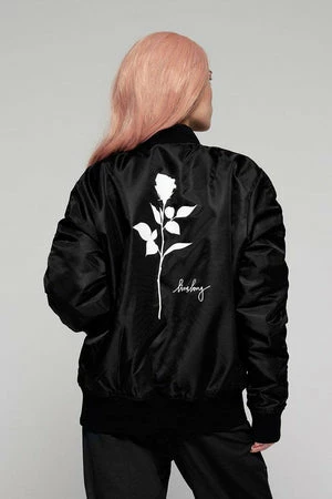 The jacket has front ’rose‘ caption print, neckline and hem ribbed cuffs, a regular fit and it fastens at the front with a zipper.