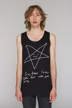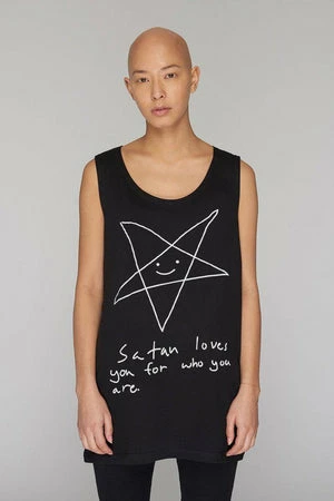 The vest has front ‘Satan loves you for who you are’ caption print, star with smiley design, a round neckline and a regular fit.