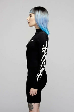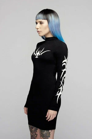 For the ultimate dark dresser this is an epic black, long sleeved bodycon dress from Long Clothing with a formidable white tribal print on the chest and arms.