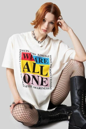 The t-shirt has ”We Are All One” front white print, crew neckline, short sleeves and a regular fit.