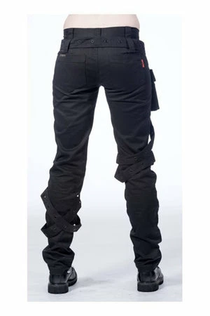 This style has long detachable bondage straps at the side, front left attached pocket, a matching belt and back pockets.