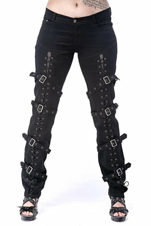 An awesome design for those who are gothic and love to rave. These baggy trousers have lace running down the front, with four buckles going down each leg. A wicked design for your wardrobe.