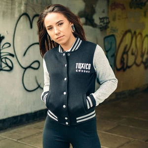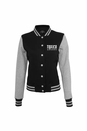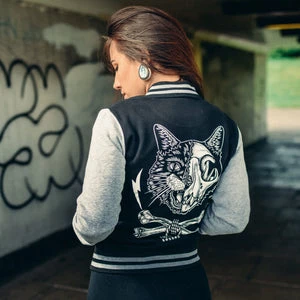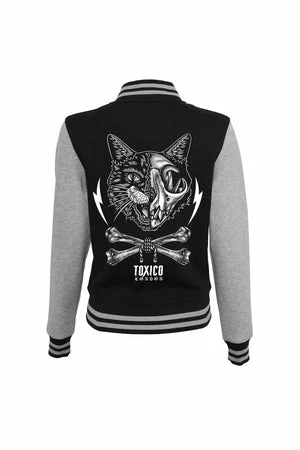 This ladies college jacket has cat skull print, Toxico tattoo print, a high neckline, ribbed cuffs, neck and hem, long sleeves and it fastens with buttons at the front.